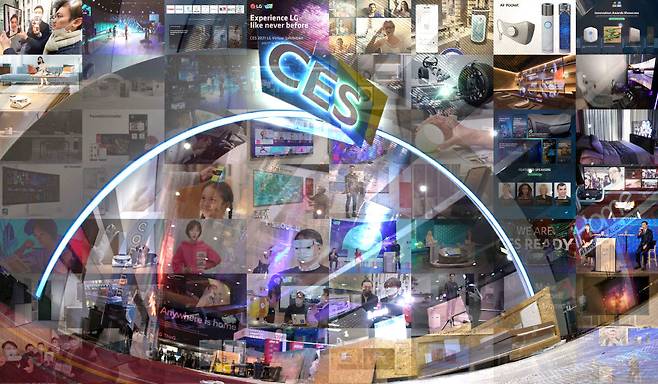 CES 2021이 1967년 국제전자제품박람회(CES) 개막 이후 55년 만에 온라인으로 진행됐다. 지난해 성황을 이룬 'CES 2020' 센트럴홀 입구 모습과 'CES 2021' 온라인 콘퍼런스, 신제품 사진을 모자이크 형식으로 표현했다.
