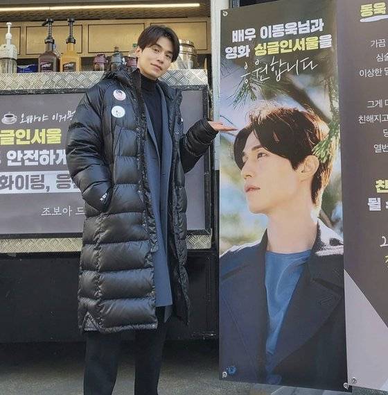 공개된 사진은 영화 '싱글 인 서울' 촬영장에 도착한 커피차 인증샷. 자신과 '싱글 인 서울' 팀을 응원하는 플래카드 및 배너 앞에 선 이동욱은 흐뭇한 미소로 포즈를 취하고 있다.
