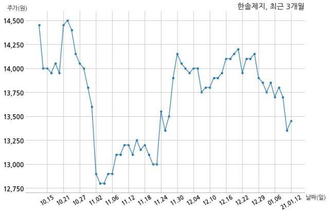 한편, 한솔제지는 장 마감 이후 해당 기업공시를 발표했으며 오늘 종가가 13,450원, 거래량은 190,823주로, 직전 거래일 대비 100원(+0.75%) 상승했다.