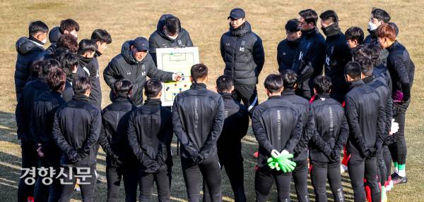 올림픽축구대표팀 김학범 감독이 12일 강릉종합경기장에서 열린 1차 국내소집훈련에서 선수들과 미팅을 하고 있다. 2021.01.12