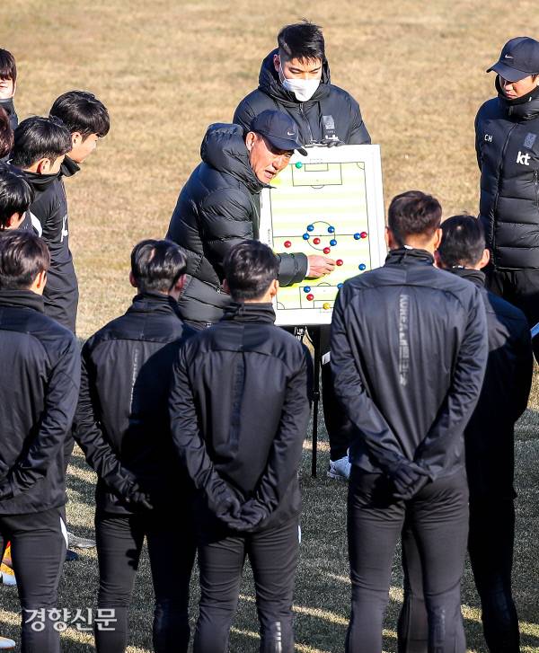 올림픽축구대표팀 김학범 감독이 12일 강릉종합경기장에서 열린 1차 국내소집훈련에서 선수들과 미팅을 하고 있다. 2021.01.12