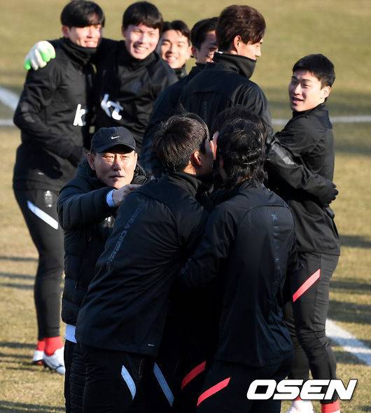 축구 올림픽대표팀 김학범 감독과 선수들이 훈련을 나서며 포옹을 나누고 있다. / dreamer@osen.co.kr