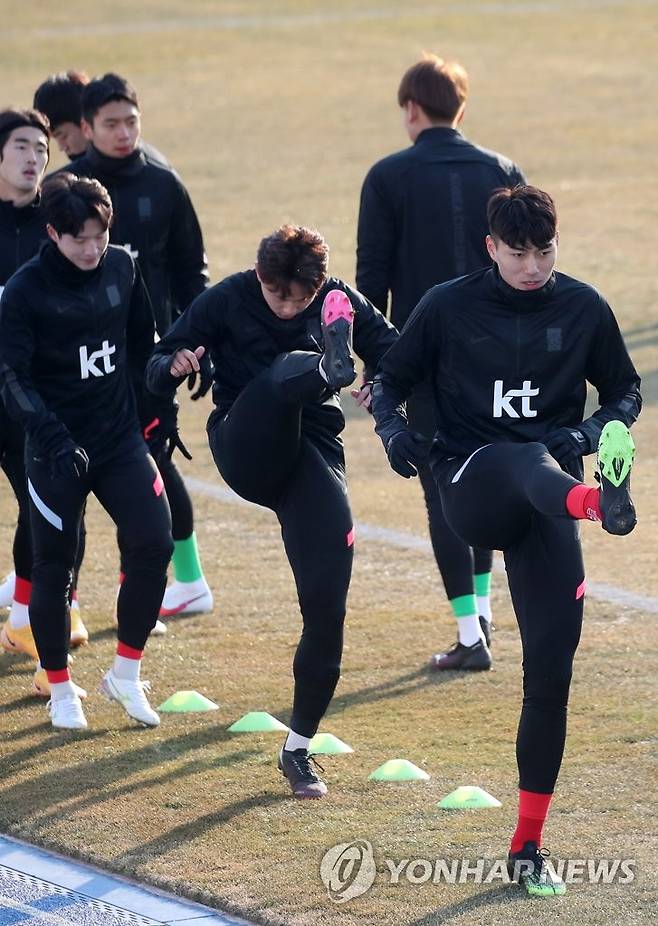 (강릉=연합뉴스) 양지웅 기자 = 대한민국 남자 올림픽 축구대표팀이 12일 오후 강원 강릉시 종합운동장에서 새해 첫 소집 훈련을 시작하며 몸을 풀고 있다. 2021.1.12