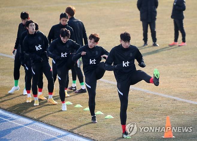 (강릉=연합뉴스) 양지웅 기자 = 대한민국 남자 올림픽 축구대표팀이 12일 오후 강원 강릉시 종합운동장에서 새해 첫 소집 훈련을 시작하며 몸을 풀고 있다. 2021.1.12