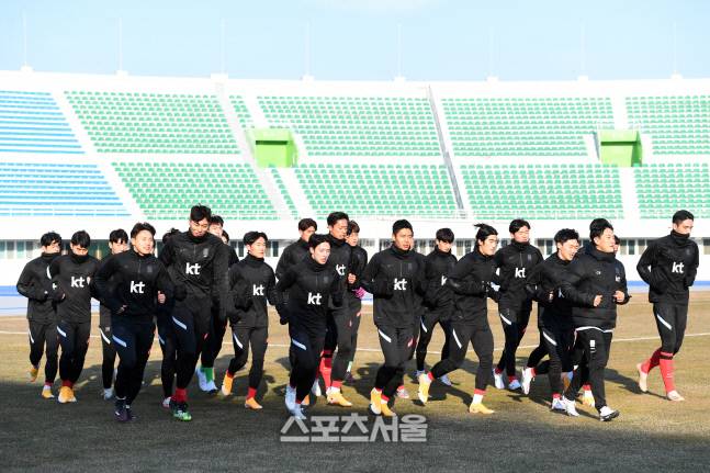 올림픽대표팀 선수들이 12일 강릉종합운동장에서 가볍게 러닝을 하며 몸을 풀고 있다. 2021. 1. 12.