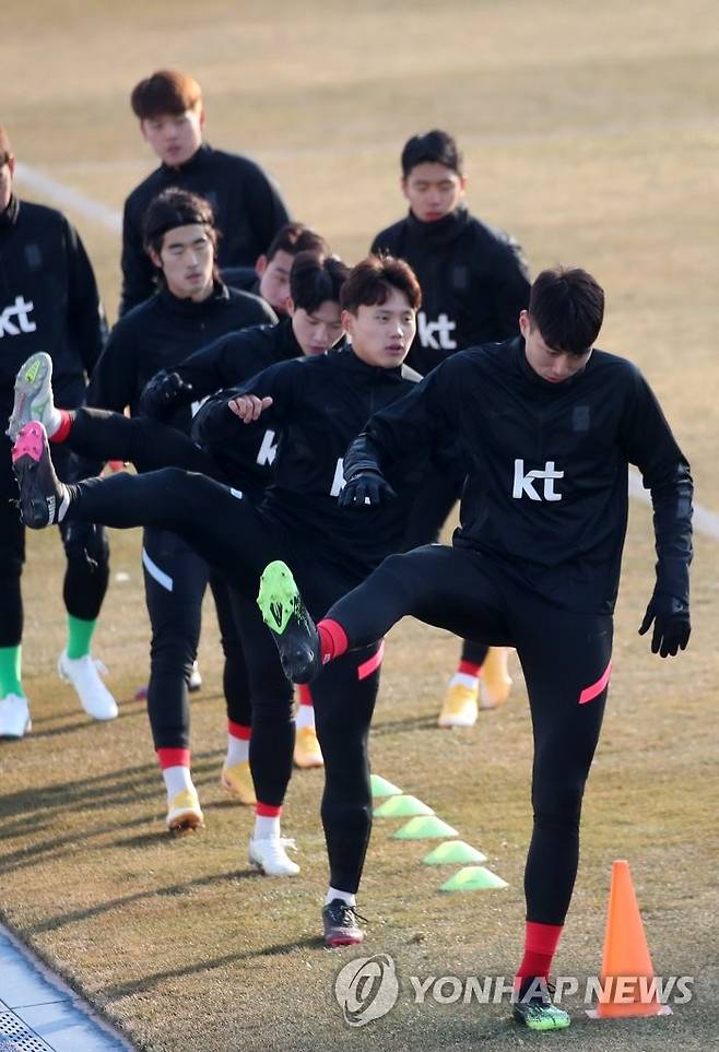 (강릉=연합뉴스) 양지웅 기자 = 대한민국 남자 올림픽 축구대표팀이 12일 오후 강원 강릉시 종합운동장에서 새해 첫 소집 훈련을 시작하며 몸을 풀고 있다. 2021.1.12