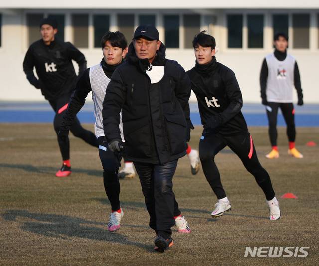 [강릉=뉴시스] 김동현 기자 = 김학범 축구 올림픽대표팀 감독이 선수들과 12일 오후 강원 강릉시 강릉종합운동장에서 도쿄올림픽 출전을 앞두고 1차 국내 전지훈련을 하고 있다. 2021.01.12. dhyeon@newsis.com