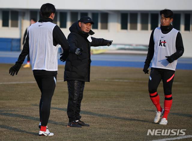 [강릉=뉴시스] 김동현 기자 = 김학범 축구 올림픽대표팀 감독이 12일 오후 강원 강릉시 강릉종합운동장에서 도쿄올림픽 출전을 앞두고 열린 1차 국내 전지훈련에서 선수들에게 전술을 설명하고 있다. 2021.01.12. dhyeon@newsis.com