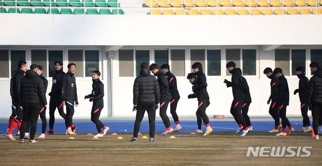 [강릉=뉴시스] 김동현 기자 = 축구 올림픽대표팀 선수들이 12일 오후 강원 강릉시 강릉종합운동장에서 도쿄올림픽 출전을 앞두고 1차 국내 전지훈련을 하고 있다. 2021.01.12. dhyeon@newsis.com