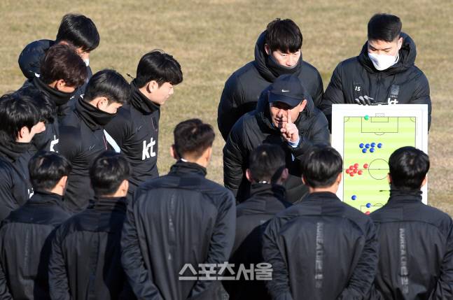 올림픽대표팀 김학범 감독(오른쪽 가운데)이 12일 강릉종합운동장에서 훈련을 시작하면서 선수들에게 이야기를 하고 있다. 2021. 1. 12.
