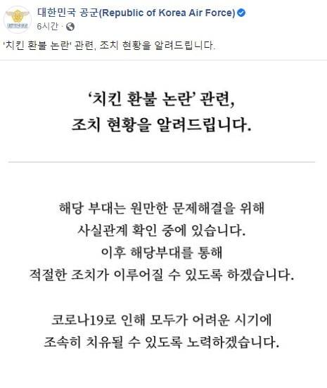 공군은 12일 공식 페이스북 계정을 통해 '치킨 환불 논란' 관련, 조치 현황을 알려드립니다' 제하의 글을 통해 "((사실 확인)이후 해당부대를 통해 적절한 조치가 이루어질 수 있도록 하겠다"고 했다.
