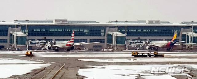 [인천공항=뉴시스]홍찬선 기자 = 수도권에 대설주의보가 내려진 12일 오후 인천국제공항에서 여객기 사이로 차량들이 제설작업을 벌이고 있다. 2021.01.21.mania@newsis.com