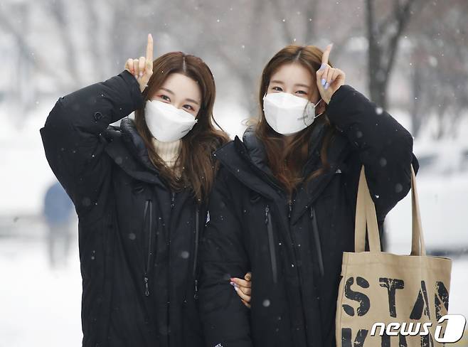 (서울=뉴스1) 권현진 기자 = 걸그룹 우아! 나나, 우연이 12일 서울 양천구 목동 SBS에서 열리는 SBS 라디오 러브게임 녹음을 위해 출근을 하며 인사를 하고 있다. 2021.1.12/뉴스1