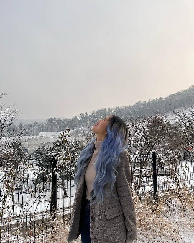 사진 속 미미는 파란색 헤어 스타일을 공개하며 상큼한 매력을 보였다.