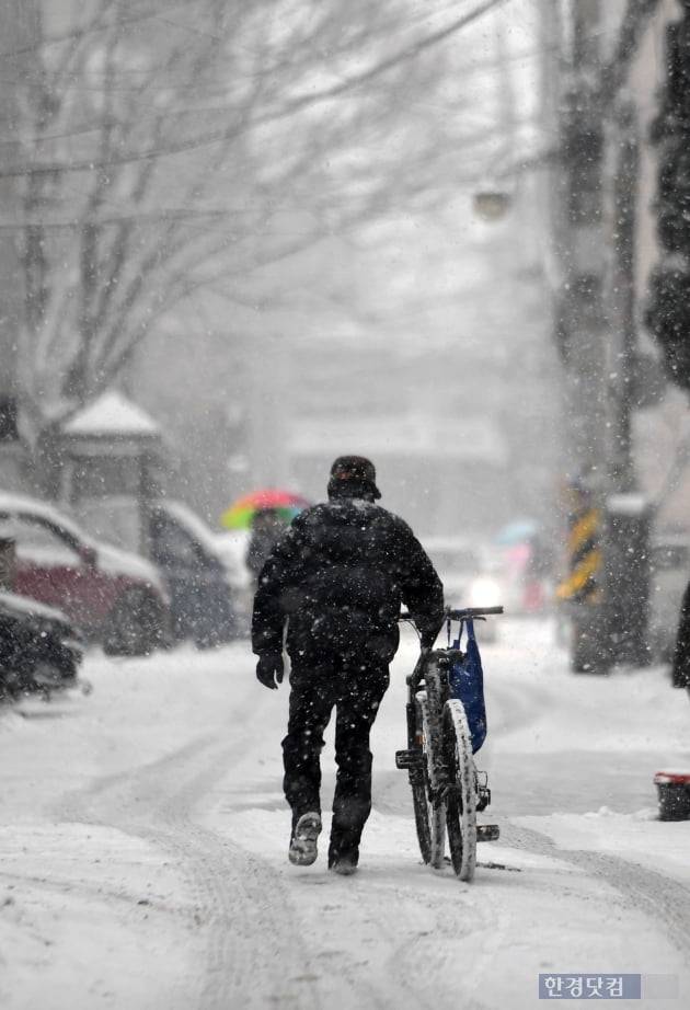 갑작스런 폭설이 내린 12일 오후 서울 방이동 일대에서 한 주민이 자전거에 내려서 이동하고 있다.