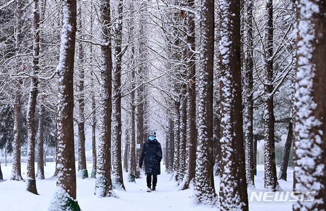 [수원=뉴시스] 김종택기자 = 한파가 주춤해진 12일 오후 경기도 수원시 팔달구 서호공원에서 한 시민이 함박눈을 맞으며 걷고 있다. 2021.01.12.