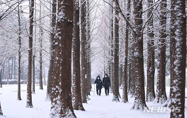 [수원=뉴시스] 김종택기자 = 한파가 주춤해진 12일 오후 경기도 수원시 팔달구 서호공원에서 한 시민이 함박눈을 맞으며 걷고 있다. 2021.01.12.
