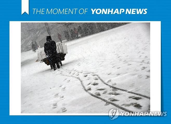 (서울=연합뉴스) 박동주 기자 = 눈이 내린 12일 오후 서울역 광장에서 한 어르신이 폐지를 실은 수레를 끌며 걸어가고 있다. 2021.1.12 [THE MOMENT OF YONHAPNEWS]