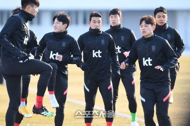 올림픽대표팀 선수들이 12일 강릉종합운동장에서 소집 훈련을 하고 있다. 2021. 1. 12.