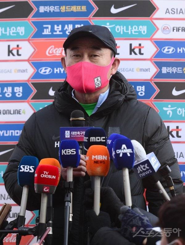 김학범 감독이 12일 강원도 강릉종합운동장에서 도쿄올림픽을 대비한 축구 올림픽대표팀의 새해 첫 소집 훈련에 앞서 기자회견을 하고 있다.