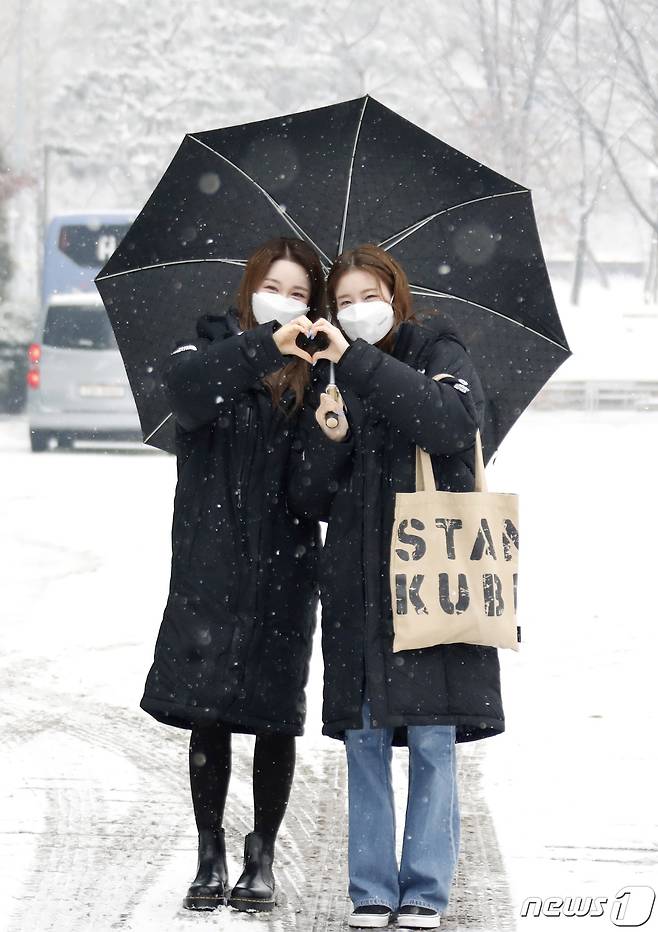 (서울=뉴스1) 권현진 기자 = 걸그룹 우아! 나나, 우연(오른쪽)이 12일 서울 양천구 목동 SBS에서 열리는 SBS 라디오 러브게임 녹음을 위해 출근을 하며 하트를 그리고 있다. 2021.1.12/뉴스1