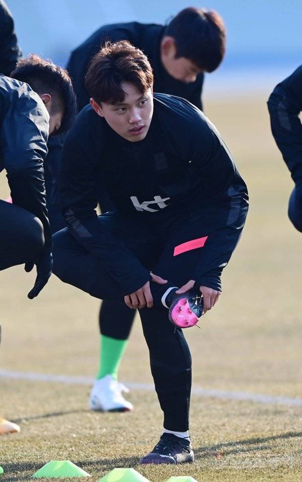 조영욱이 12일 강원도 강릉종합운동장에서 도쿄올림픽을 대비한 축구 올림픽대표팀의 새해 첫 소집 훈련에서 몸을 풀고 있다.