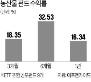 12일 에프앤가이드에 따르면 상장지수펀드(ETF) 포함 농산물 펀드 9개의 6개월 평균 수익률은 32.53%로 집계됐다. 같은 기간 원자재펀드의 수익률 15.10%를 두 배 이상 웃돈다. 농산물펀드는 최근 한 달 수익률도 12%를 넘으며 좋은 성과를 이어가고 있다.