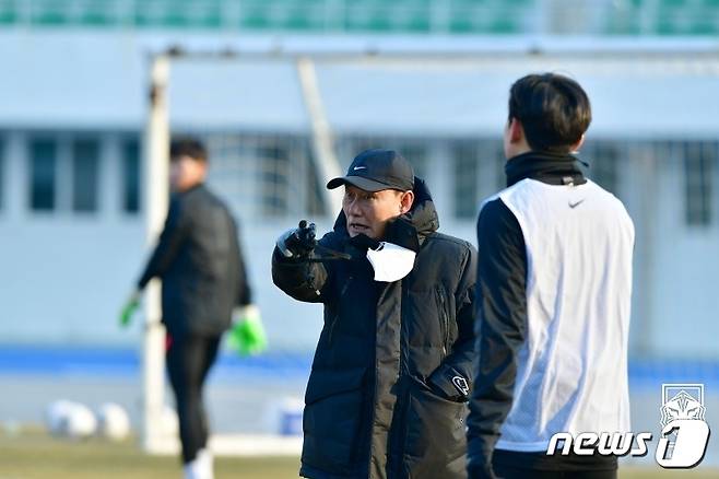 (강릉=뉴스1) = 김학범 남자 올림픽 축구대표팀 감독이 12일 오후 강릉 종합운동장에서 열린 1차 국내 소집훈련에서 훈련 지시를 하고 있다.(대한축구협회 제공) 2021.1.12/뉴스1