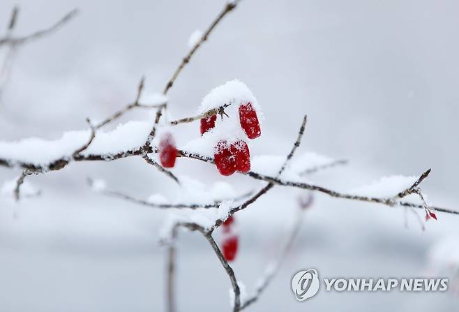 (고양=연합뉴스) 김병만 기자 = 많은 눈이 내린 12일 오후 경기도 고양시에서 산수유 열매 위로 눈이 소복하게 쌓여 있다.