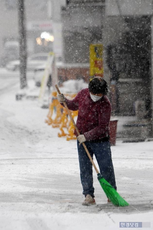 갑작스런 폭설이 내린 12일 오후 서울 방이동 일대에서 주민들이 제설작업을 하고 있다.
