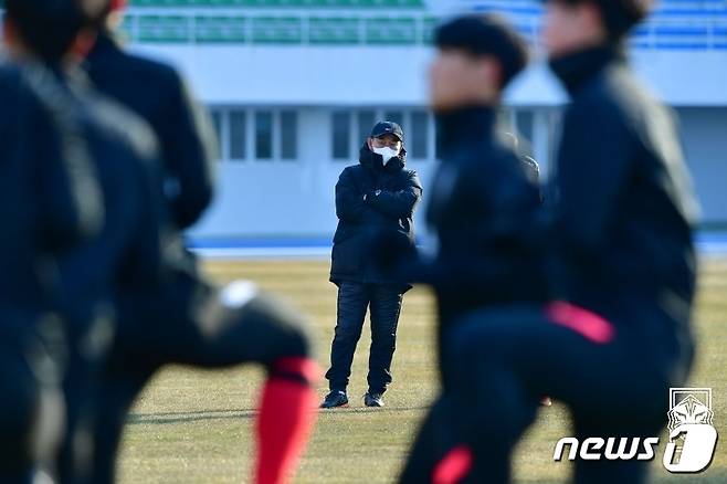(강릉=뉴스1) = 김학범 남자 올림픽 축구대표팀 감독이 12일 오후 강릉 종합운동장에서 열린 1차 국내 소집훈련에서 선수들을 바라보고 있다.(대한축구협회 제공) 2021.1.12/뉴스1