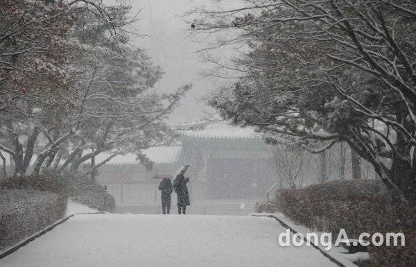 서울과 수도권에 함박눈이 내리고 있다. 12일 오후 서울 종로구 경희궁공원에서 시민들이 눈을 즐기고 있다. 기상청은 "12일 오후 수도권을 중심으로 함박눈이 내리고 있다. 강한 눈이 내리는 시간대가 퇴근시간과 맞물려 교통 혼잡이 예상되고, 차량 운행시 충분한 안전거리를 확보하기를 바란다"고 전했다.