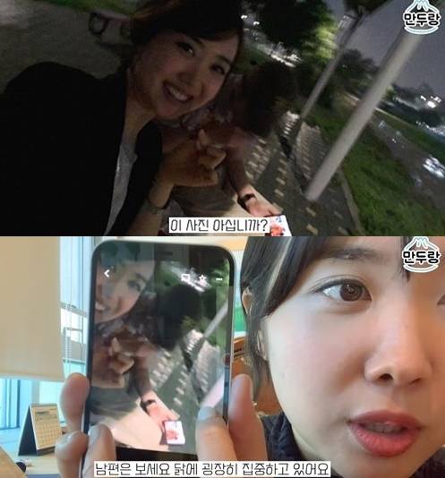그는 “당시 한강에서 치킨을 먹으면서 이렇게 셀카를 찍었다. 남편을 보시라. 닭에 굉장히 집중하고 있다”며 뒷이야기를 전했다.