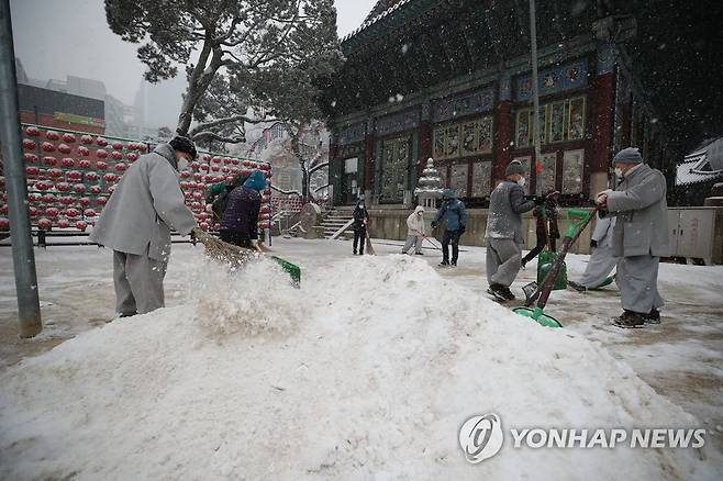 (서울=연합뉴스) 황광모 기자 = 서울을 비롯한 수도권에 기습 폭설이 내린 12일 오후 서울 종로구 조계사에서 스님들과 관계자들이 마당에 쌓인 눈을 치우고 있다. 2021.1.12