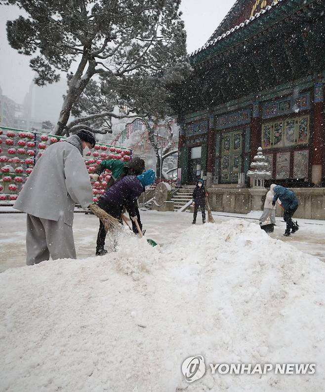 (서울=연합뉴스) 황광모 기자 = 서울을 비롯한 수도권에 기습 폭설이 내린 12일 오후 서울 종로구 조계사에서 스님들과 관계자들이 마당에 쌓인 눈을 치우고 있다. 2021.1.12