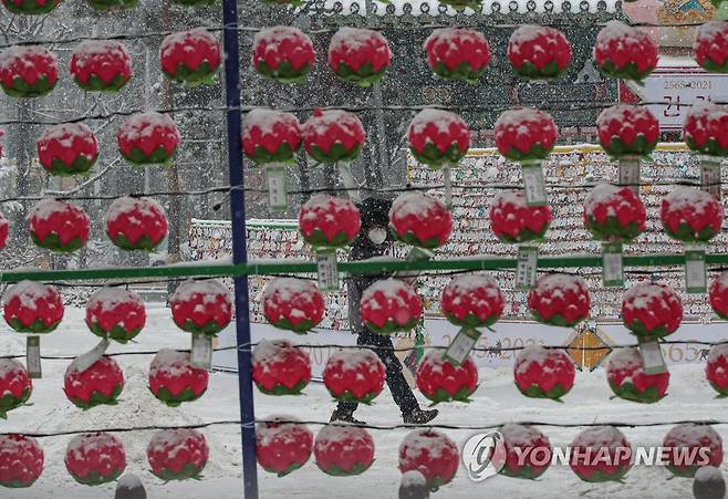 (서울=연합뉴스) 황광모 기자 = 서울을 비롯한 수도권에 기습 폭설이 내린 12일 오후 서울 종로구 조계사를 찾은 시민이 우산을 쓰고 경내를 걷고 있다. 2021.1.12