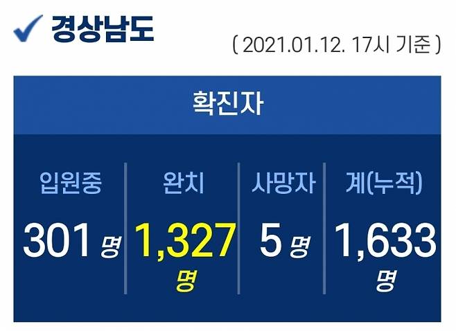 12일 오후 5시 기준, 경남도내 입원 중인 확진자는 301명이고, 퇴원 1327명, 사망 5명, 누적 확진자는 총 1633명이다.