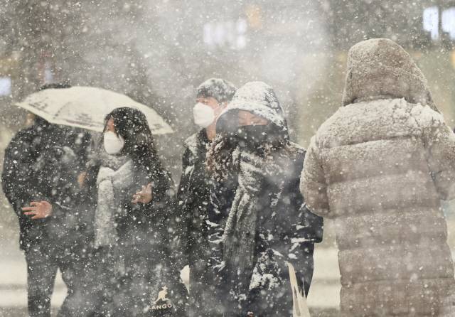 [서울경제] 서울 일부 지역을 비롯한 전국 곳곳에 대설특보가 내려진 12일 오후 서울 종로구 세종대로에서 시민들이 눈을 맞으며 발걸음을 재촉하고 있다. 기상청은 이날 서울 동남·서남권과 인천, 경기, 충남 등지에 대설주의보를 발효했다. /오승현기자