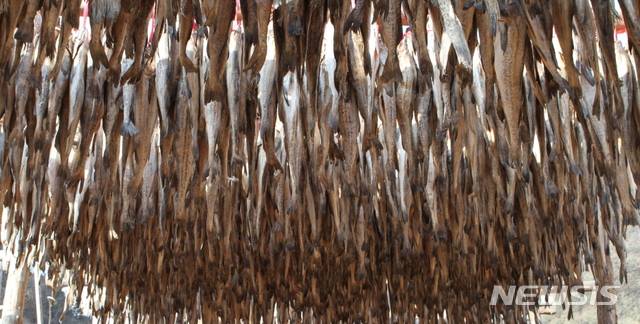 [인제=뉴시스] 한윤식 기자 = 북극 한파가 주춤해진 12일 오후 강원 인제군 북면 용대리 덕장에 내걸린 황태가 황금빛으로 익어가고 있다. 2021. 01. 12. ysh@newsis.com