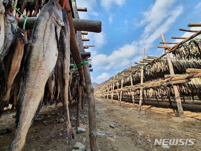 [인제=뉴시스] 한윤식 기자 = 북극 한파가 주춤해진 12일 오후 강원 인제군 북면 용대리 덕장에 내걸린 황태가 황금빛으로 익어가고 있다. 2021. 01. 12. ysh@newsis.com