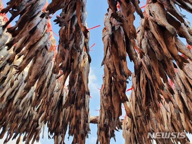 [인제=뉴시스] 한윤식 기자 = 북극 한파가 주춤해진 12일 오후 강원 인제군 북면 용대리 덕장에 내걸린 황태가 황금빛으로 익어가고 있다. 2021. 01. 12. ysh@newsis.com