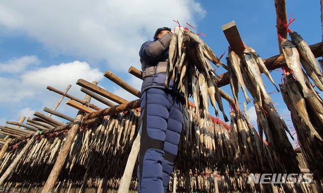[인제=뉴시스] 한윤식 기자 = 북극 한파가 주춤해진 12일 오후 강원 인제군 북면 용대리 다리골 황태덕장 김대식 대표가 건조작업에 한창이다. 2021. 01. 12. ysh@newsis.com