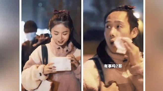 모자와 마스크를 쓴 남성이 이 여성의 뒤를 쫓고 있는데요, 불안감을 느낀 여성은 가방에서 재빨리 클렌징 티슈를 꺼내서 화장을 지우기 시작합니다.
