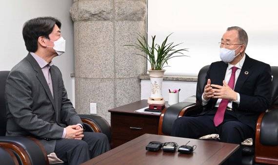 안철수 국민의당 대표(왼쪽)와 반기문 전 UN 사무총장이 12일 서울 종로구 '보다나은미래를위한 반기문재단'에서 만나 대화를 나누고 있다. 안 대표는 오는 4월 서울시장 보궐선거 출마 선언 이후 김동길 연세대 명예교수 등 사회 원로들을 만나며 광폭 행보를 이어가고 있다.