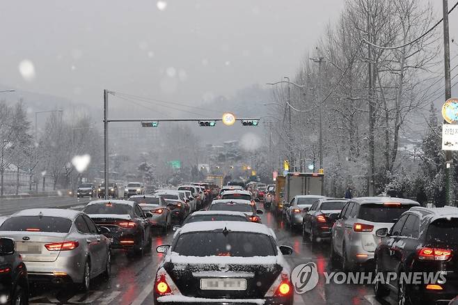 (서울=연합뉴스) 임화영 기자 = 대설주의보가 발효된 12일 오후 서울 관악구 남태령고개 부근에서 눈으로 인한 차량정체가 발생하고 있다. 2021.1.12