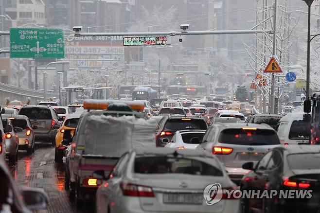 (서울=연합뉴스) 임화영 기자 = 대설주의보가 발효된 12일 오후 서울 동작구 사당역 인근에서 눈으로 인한 차량정체가 발생하고 있다. 2021.1.12