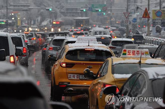 (서울=연합뉴스) 임화영 기자 = 대설주의보가 발효된 12일 오후 서울 동작구 사당역 인근에서 눈으로 인한 차량정체가 발생하고 있다. 2021.1.12