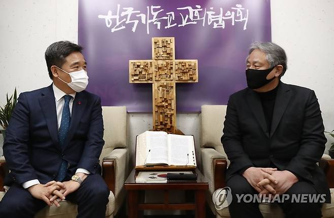 (서울=연합뉴스) 진연수 기자 =서정협 서울시장 권한대행(왼쪽)이 12일 오후 서울 종로구 한국기독교교회협의회를 방문해 이홍정 한국기독교교회협의회 총무와 면담하고 있다. 2021.1.12