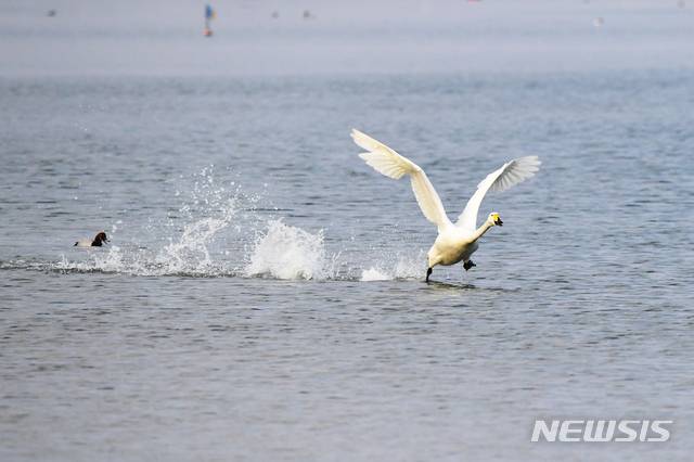 [남해=뉴시스] 차용현 기자 = 12일 오후 경남 남해군 선소마을 인근 해안에서 천연기념물 201-2호인 큰고니가 날아오르기 위해 수면 위를 내달리고 있다. 2021.01.12. con@newsis.com