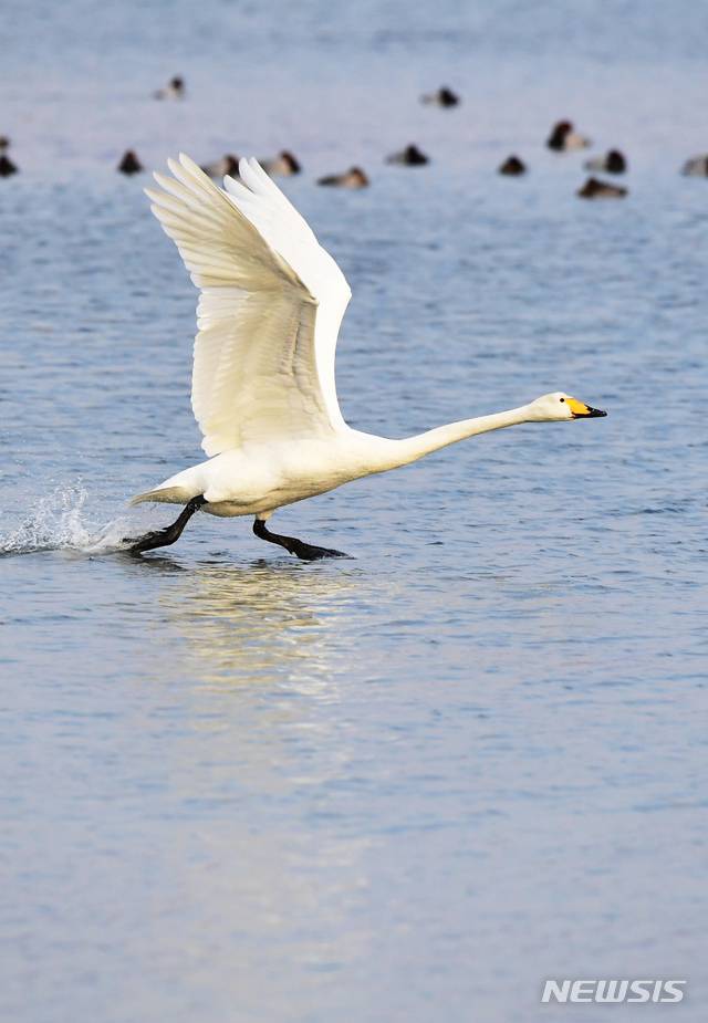 [남해=뉴시스] 차용현 기자 = 12일 오후 경남 남해군 선소마을 인근 해안에서 천연기념물 201-2호인 큰고니가 날아오르기 위해 수면 위를 내달리고 있다. 2021.01.12. con@newsis.com